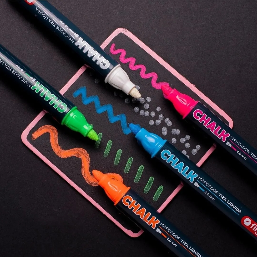 Marcadores de tinta líquida a base de agua y sistema de válvula que evita el secado. Punta redonda con trazo de 3mm. Se borra con un paño húmedo. Para usar sobre: pizarra blanca, pizarra negra o verde, vidrio, espejo, metal.